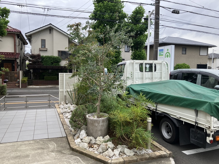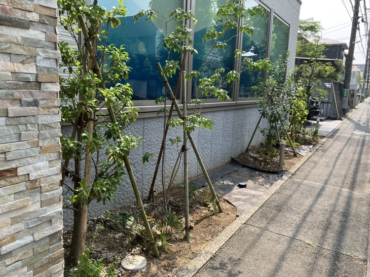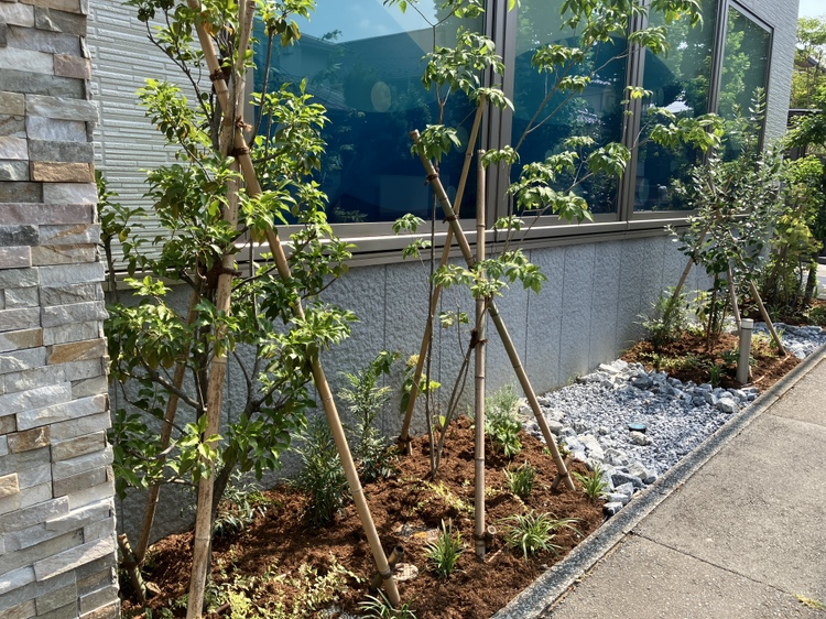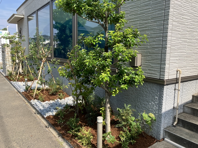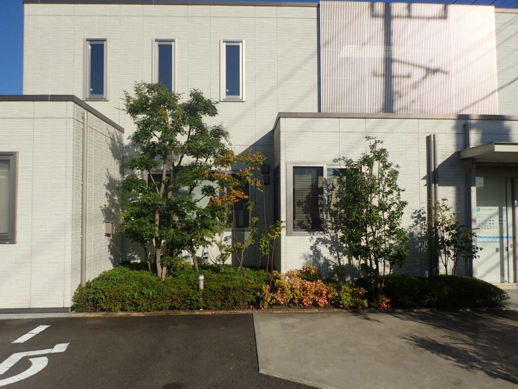 内科クリニックでは、もともと和テイストの植物が多く植栽されており、院長先生のご要望で、シンプルな中にもインパクトを持たせた設計をおこない、建物と調和するデザインを考えました。