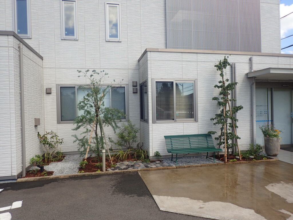 メインのお庭は、施工前は緑が多くとてもよいのですが植物が大きく、バランスがとれておりませんでした。植物もモミジ、サツキ、オタフクナンテンなどの和の植物が植えられておりました。施工後はミモザをメインツリーに季節で花が楽しめるように、多種の草花を植えました。ポイントでグリーンのベンチを設置し、患者様が荷物を置いたり、少し休憩できる場所を作りました。