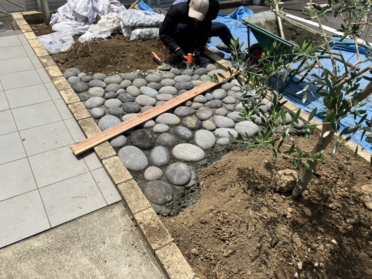 ひとつひとつ丁寧に玉石を敷設していきます。ただ置くのではなく、大小や向きなど、色々と考えて設置してます。職人技術です!