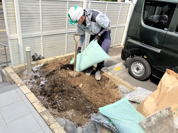 植栽するときは土壌改良が大事です。独自の配合で、現場の土に合った改良を行います。