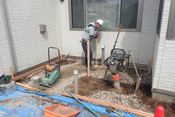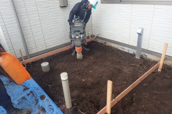 地面を転圧して、重いものが乗っても下がらないようにします。