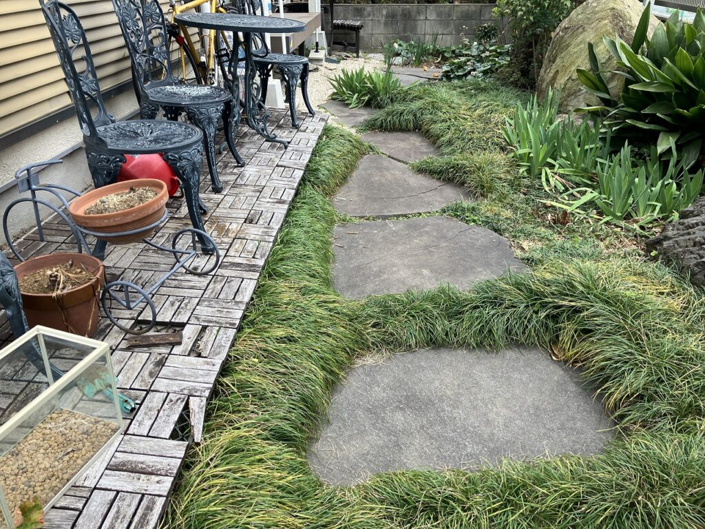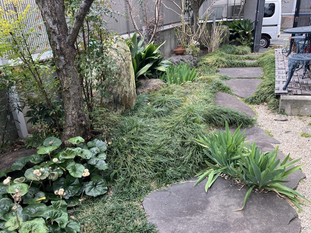 繁茂しているリュウノヒゲ撤去を撤去します。