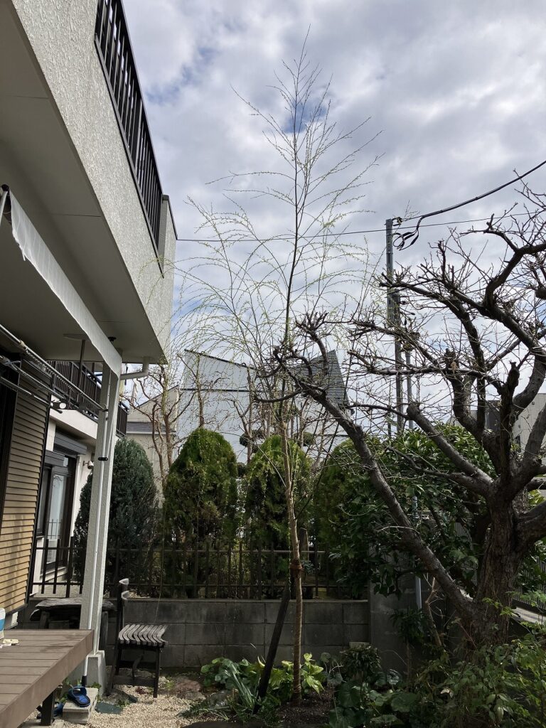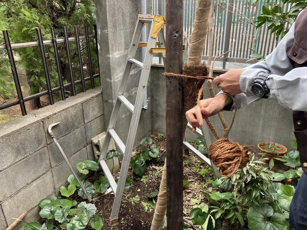 最後に支柱を立て、倒木や揺れを防ぎ根の活着を促します。